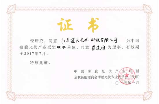 1月13日,中国薄膜光伏产业联盟在北京宣告成立,江苏蓝天光伏科技有限公司受邀成为联盟理事单位,公司总经理瞿建国先生同时受聘为该联盟理事。